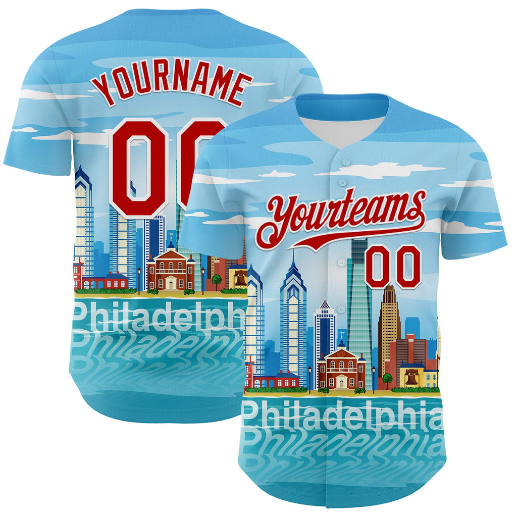 Maxcorners Custom Blue Red-White 3D Pattern Design Philadelphia Cityscape Skyline Premium Baseball Jersey LM0210