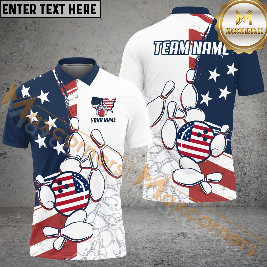 Maxcorners Bowling And Pins Liberty Roll US Flag Personalized Name And Team Name 3D Shirt TU2006