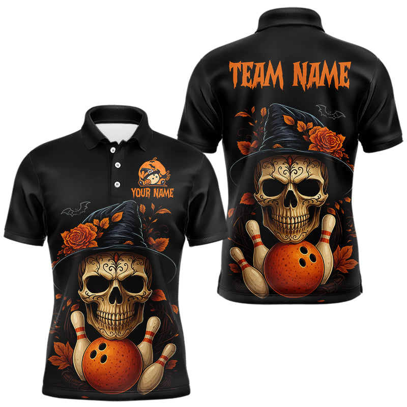 Maxcorners Black and Orange Skull Bowling Polo, Quarter Zip Shirts For Men Custom Halloween Bowling Team Jerseys LM0910