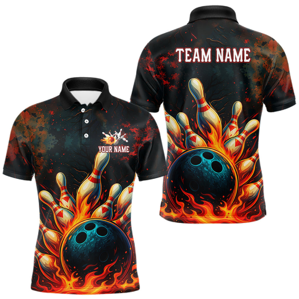 Maxcorners Red Flame Bowling Polo, Quarter Zip Shirts for Men Custom Team Bowling Outfit, Gift for Bowlers LM2509