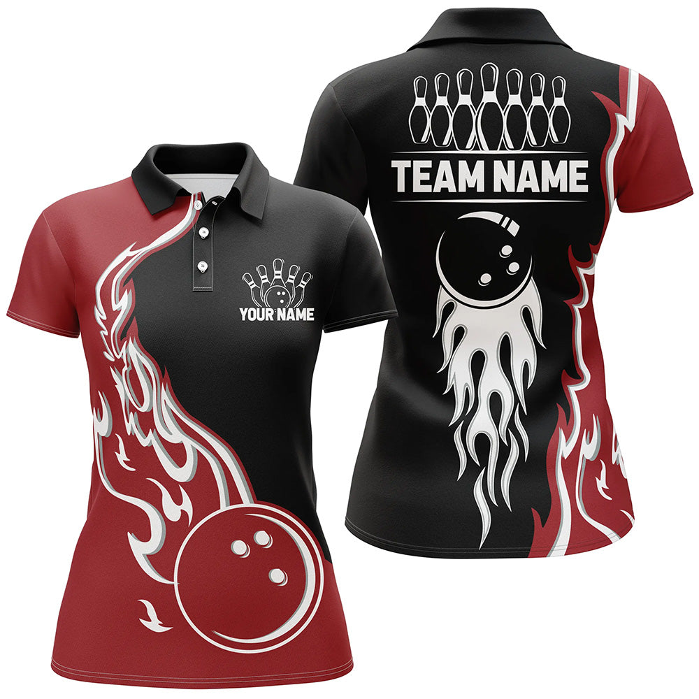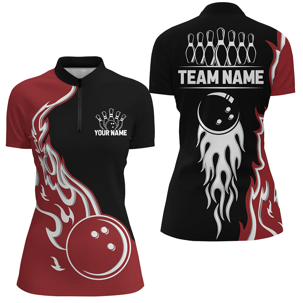 Maxcorners Black and Red Flame Bowling Polo, Quarter Zip Shirt for Women Custom Team Bowling Jersey Bowler Outfit