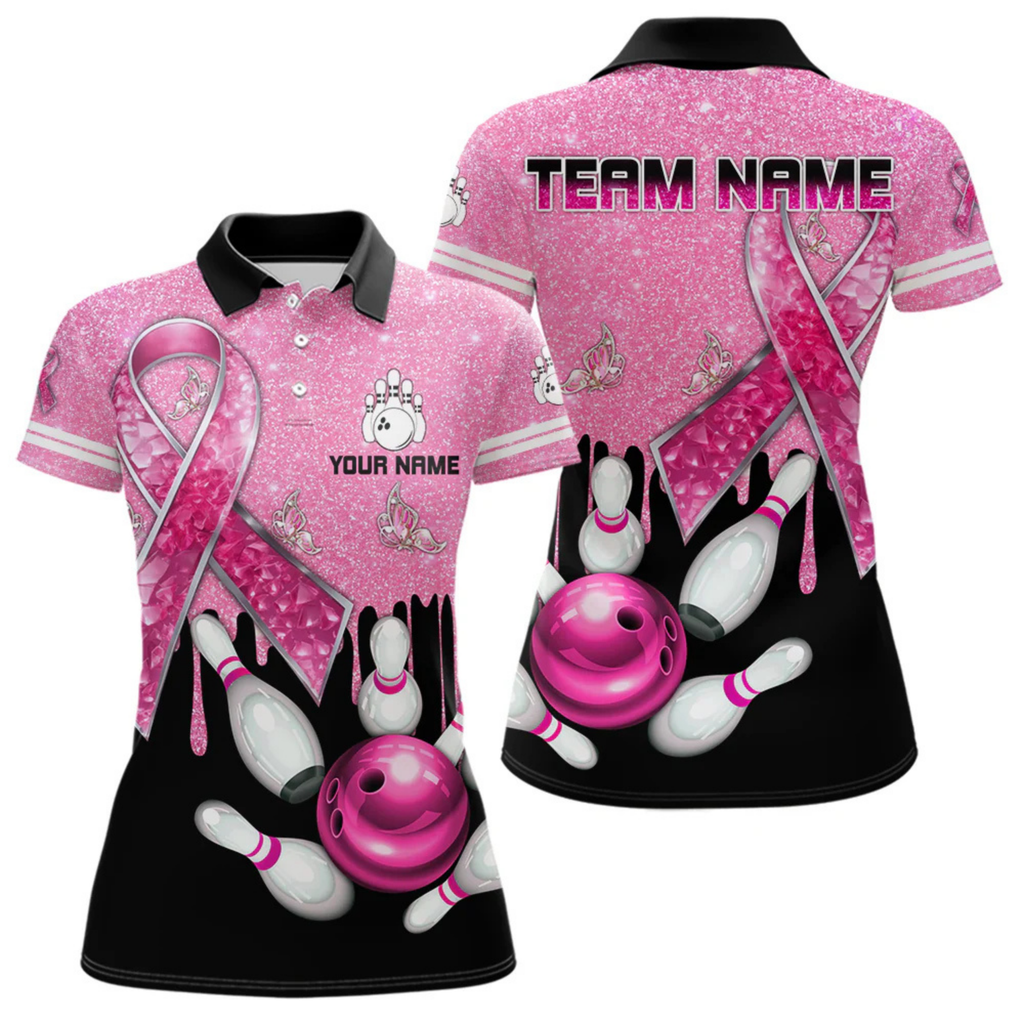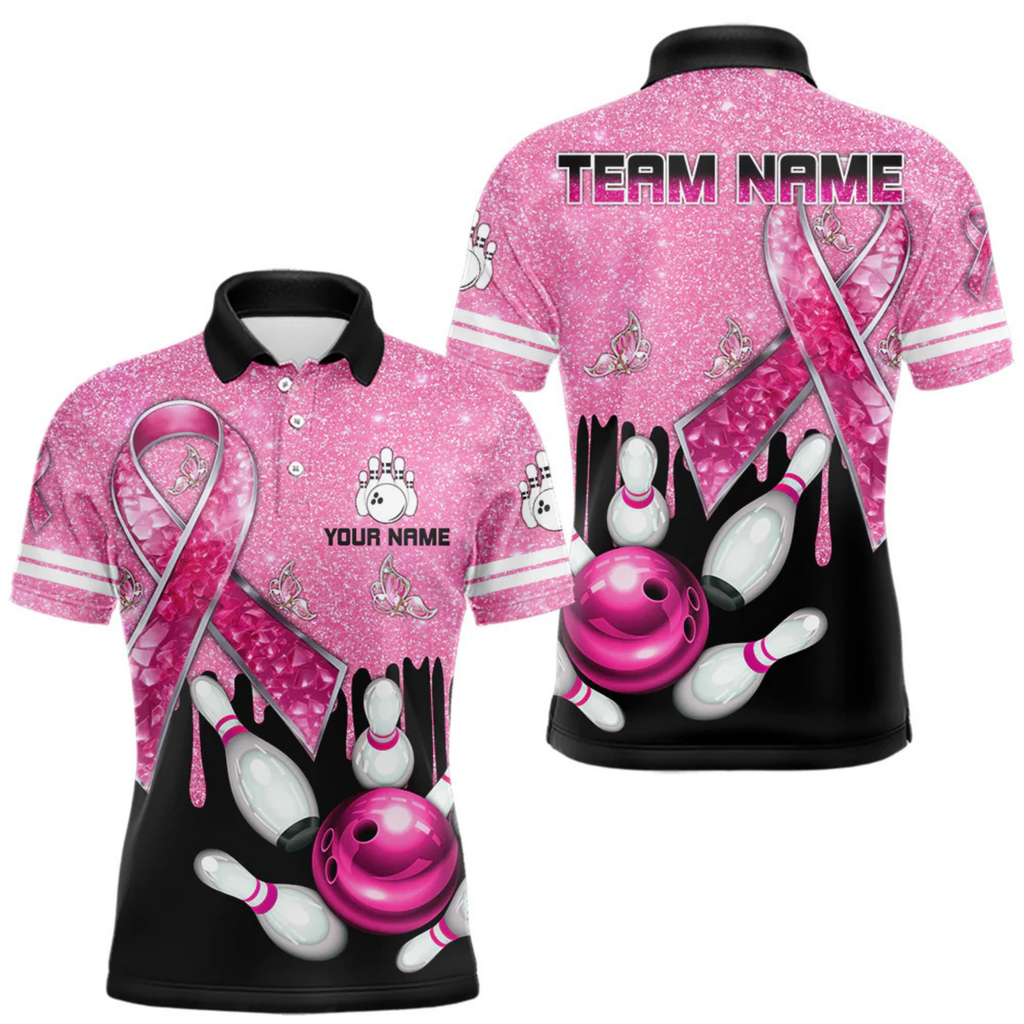 Maxcorners Black And Pink Ribbon Glitter Bowling Shirts For Men Custom Breast Cancer Team Bowling Jerseys LM105