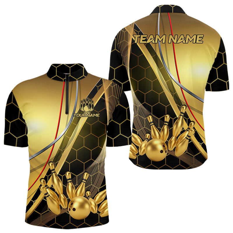 Maxcorners Custom Black and Gold Bowling Polo, Quarter Zip Shirts For Men, Bowling Team League Jersey LM2707