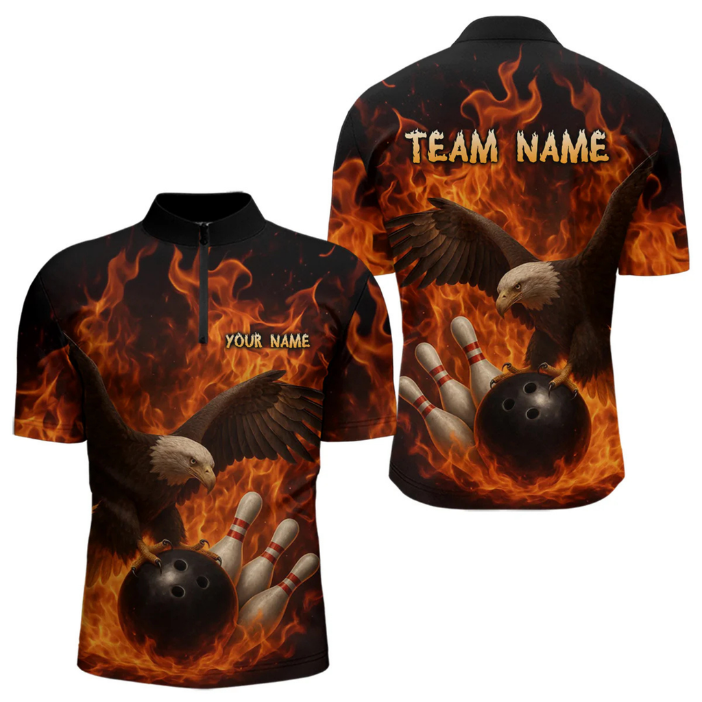 Maxcorners Flame Eagle Bowling Polo, Quarter Zip Shirts For Men Custom Eagle Bowling Team Jerseys LM1805
