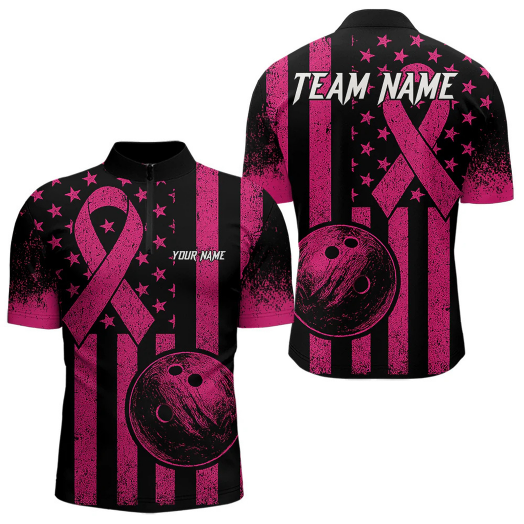 Maxcorners Black and Pink ribbon American Flag Bowling Shirts For Men Custom Breast Cancer team bowling shirts LM064