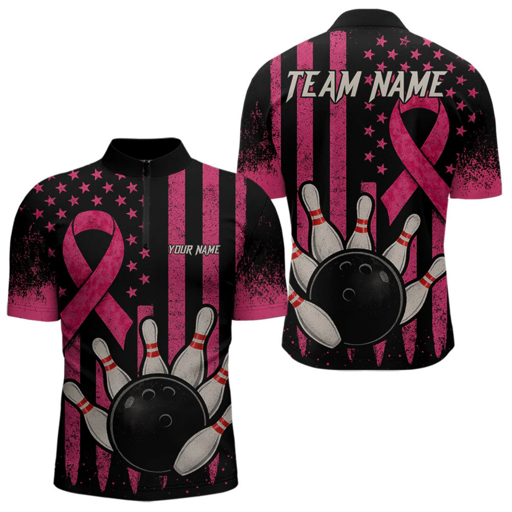 Maxcorners Black and Pink ribbon American Flag Breast Cancer Bowling Shirts For Men Custom Bowling Team Jerseys LM064