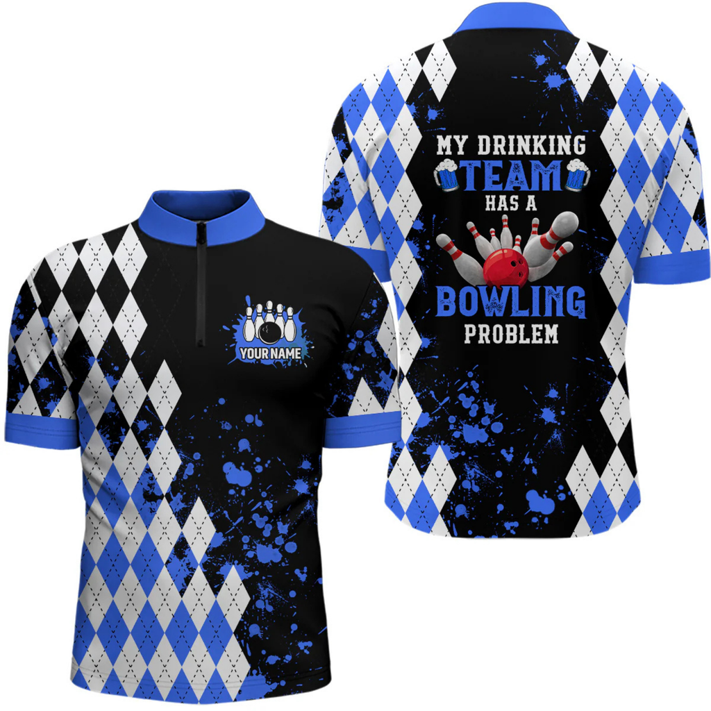 Maxcorners Blue argyle pattern Retro Bowling Shirts For Men Custom My drinking team has a bowling problem LM054