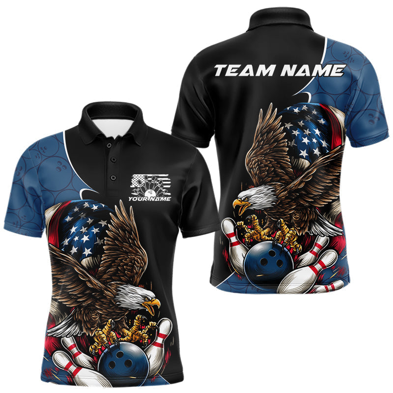 Maxcorners Custom American Flag Eagle Bowling Team Men Polo Shirts, Patriotic US Bowling League Shirt TU1407