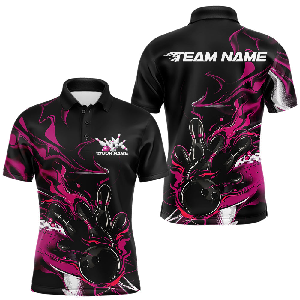 Maxcorners Custom Black And Pink Camo Flame Bowling Team Polo Shirts For Men, Bowling Jerseys TU1609
