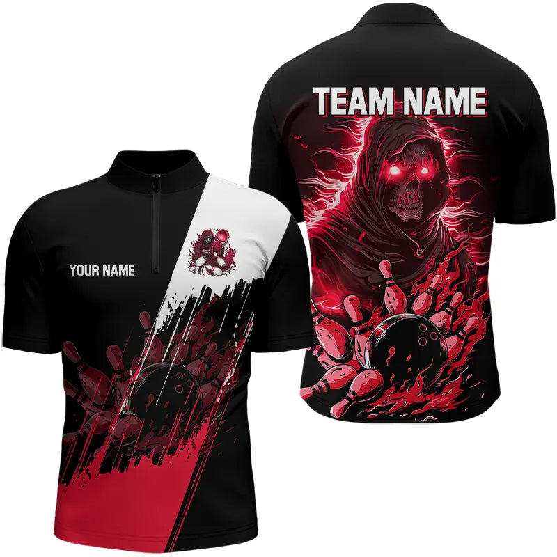 Maxcorners Black and Red Skull reaper bowling jerseys Polo, 1/4 Zip Shirt for Men Custom Bowling Team shirts