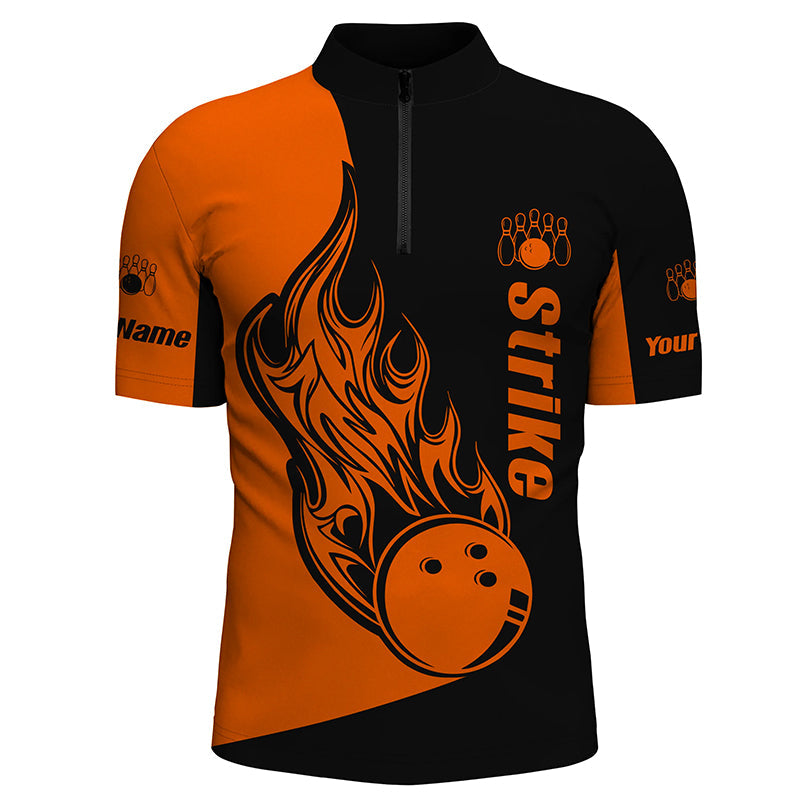 MaxCorners Bowling Ball And Pins Black And Orange Customized Name, Team Name 3D Stand Collar Zipper Polo Shirt