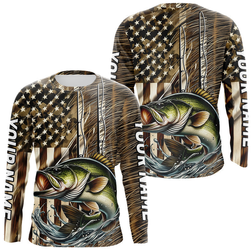 Maxcorners Custom Patriotic Camouflage American Flag Rod Largemouth Bass Long Sleeve Fishing Shirts LM0607