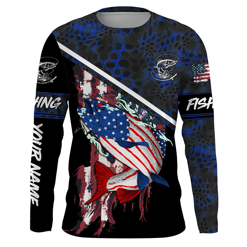 Maxcorners American Flag trout fishing blue camo Custom name trout long sleeve Fishing Shirts LM2408