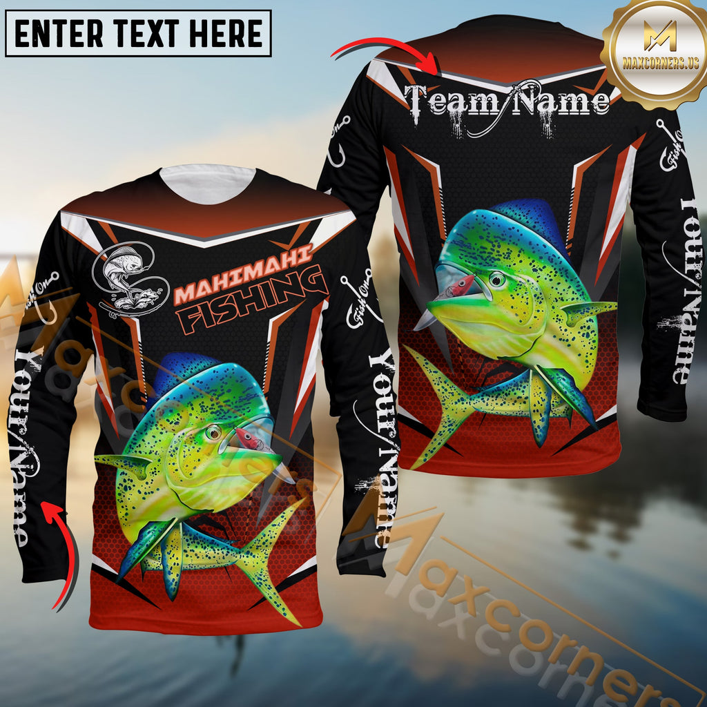 Maxcorners Mahi - Mahi Fishing Black Red Gradient Hexagon Pattern Sport Custom Name & Team Name 3D Shirts