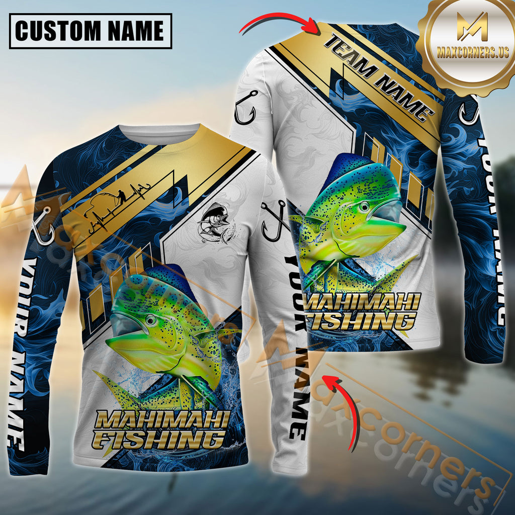 Maxcorners Mahi-Mahi Fishing Blue Flame With Golden Line Hook Design Pattern Sport Jersey Personalized Name, Team Name Long Sleeve Shirt