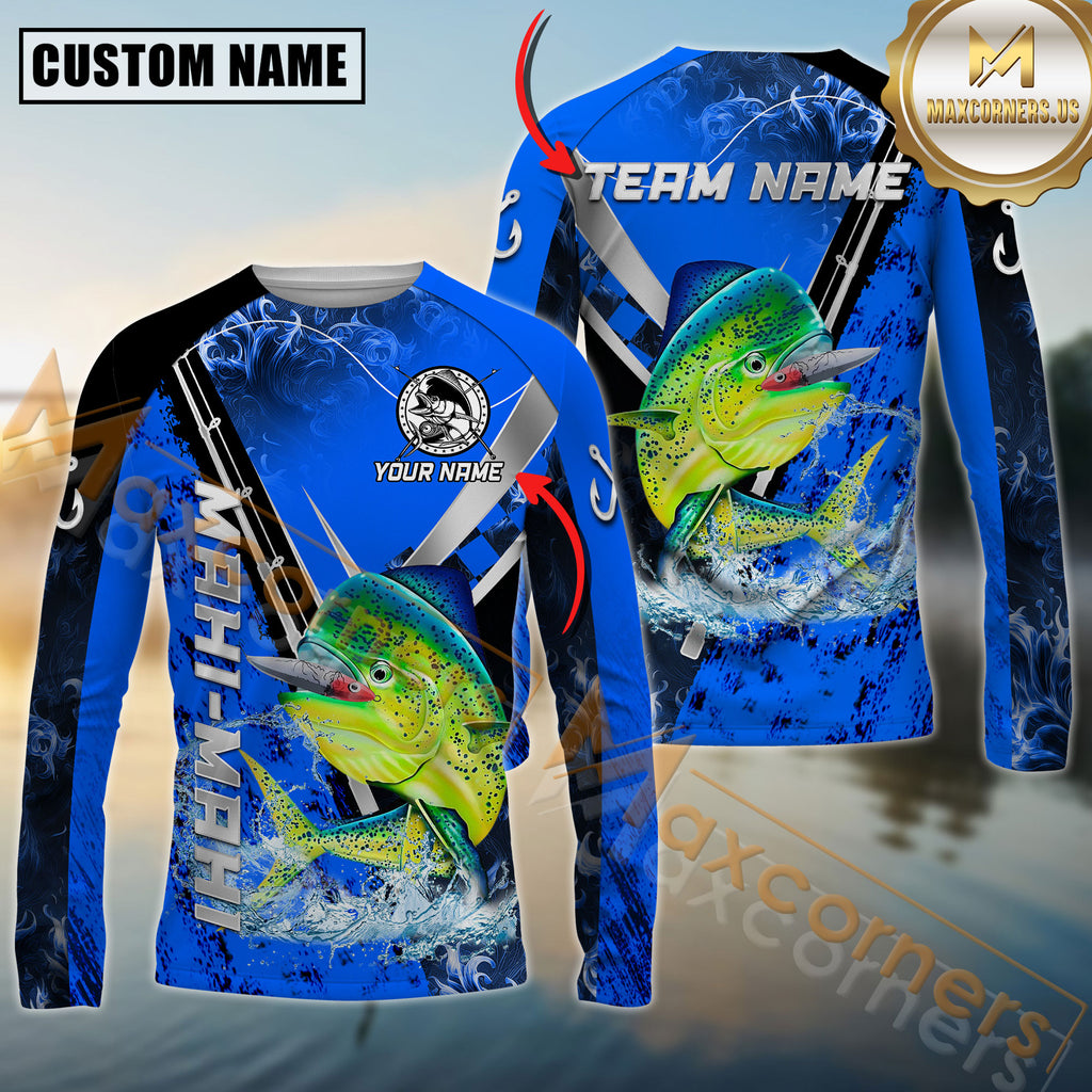 Maxcorners Mahi-Mahi Fishing Dark Blue Flame Silver Reel Pattern Jersey Personalized Name, Team Name Long Sleeve Shirt