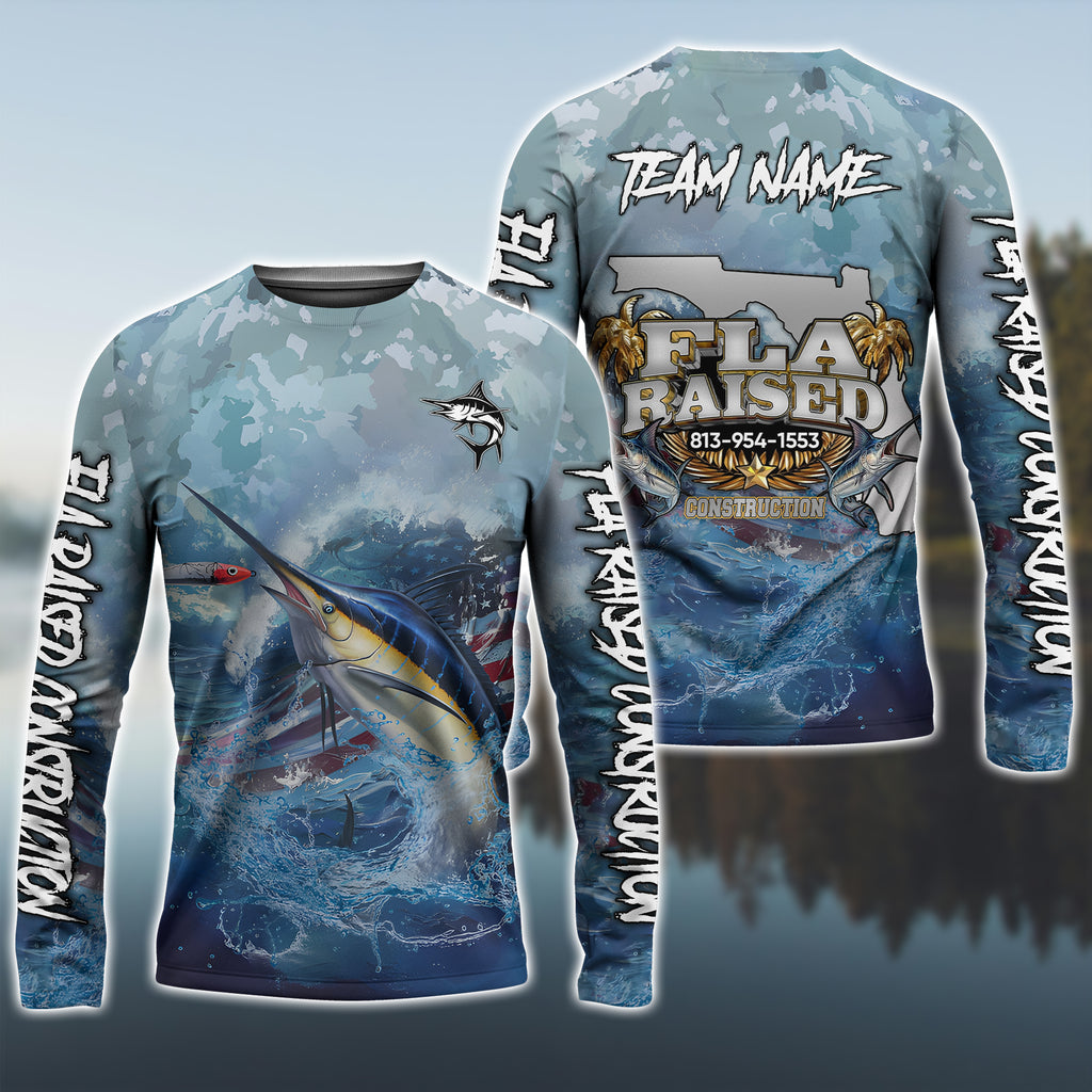Maxcorners Marlin Fishing USA Flag Blue Seawave Pattern Sport Custom Name & Team Name 3D Shirts For Ed