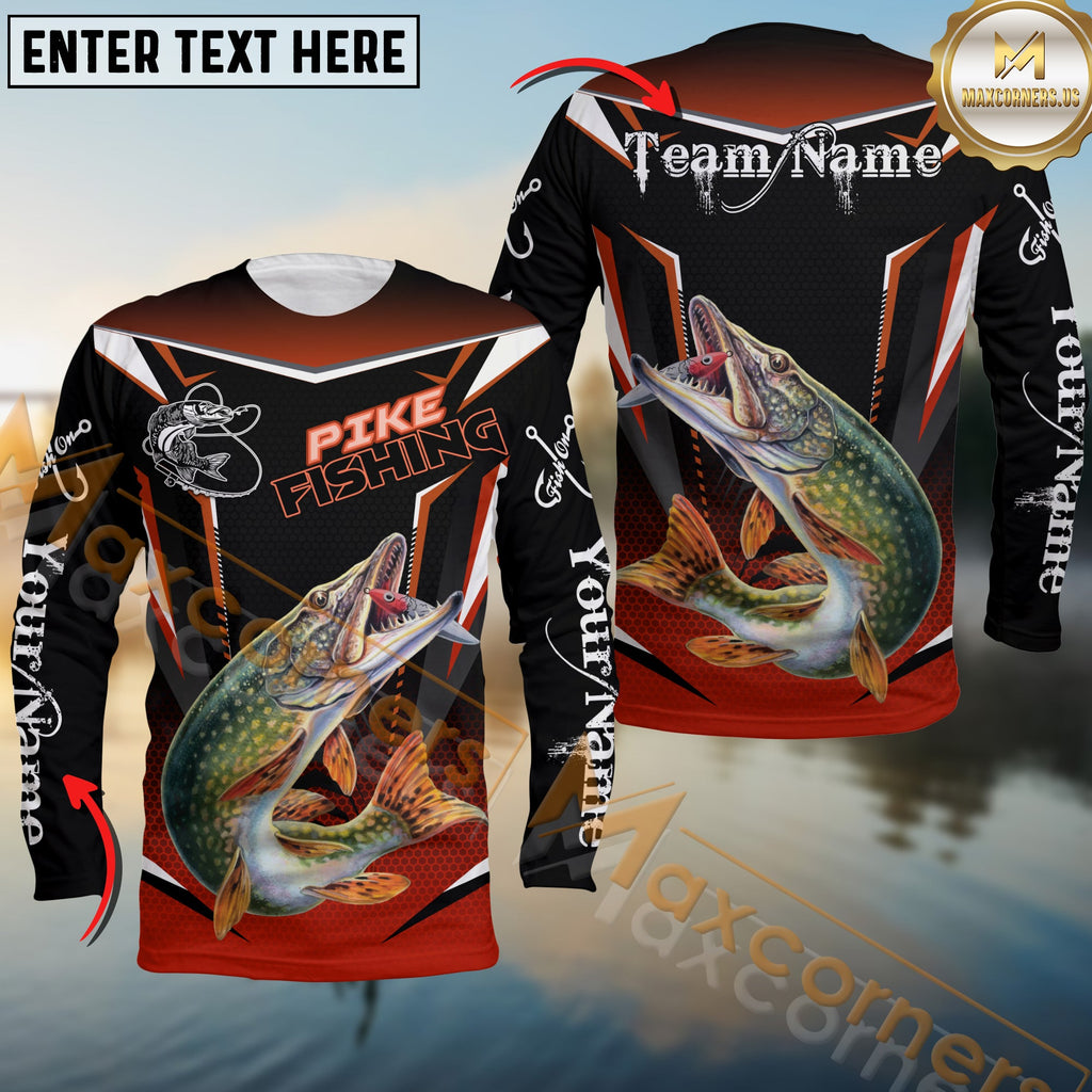 Maxcorners Pike Fishing Black Red Gradient Hexagon Pattern Sport Custom Name & Team Name 3D Shirts