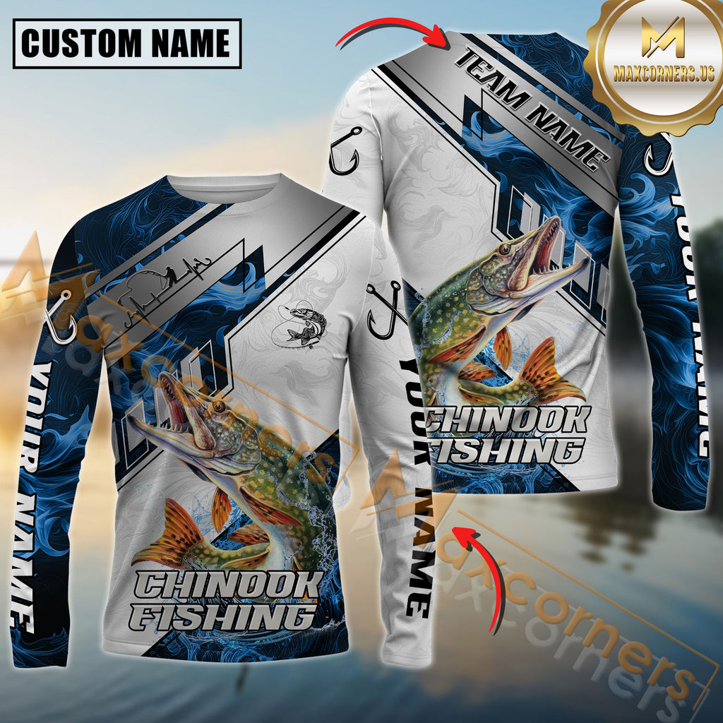 Maxcorners Pike Fishing Blue Flame With Silver Line Hook Design Pattern Sport Jersey Personalized Name, Team Name Long Sleeve Shirt