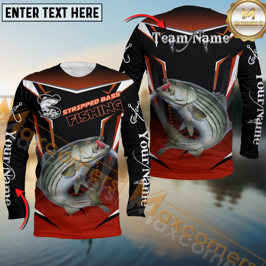 Maxcorners Stripped Bass Fishing Black Red Gradient Hexagon Pattern Sport Custom Name & Team Name 3D Shirts