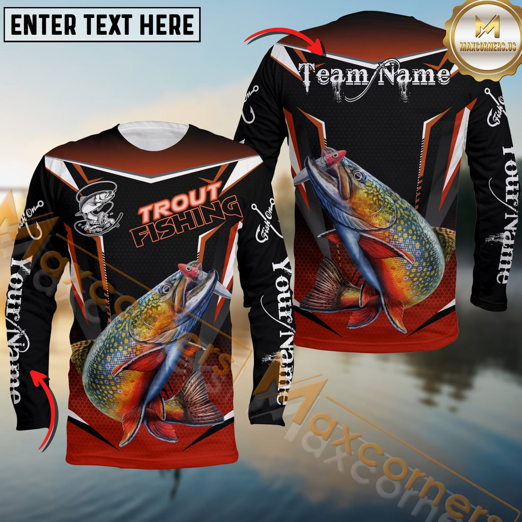 Maxcorners Trout Fishing Black Red Gradient Hexagon Pattern Sport Custom Name & Team Name 3D Shirts