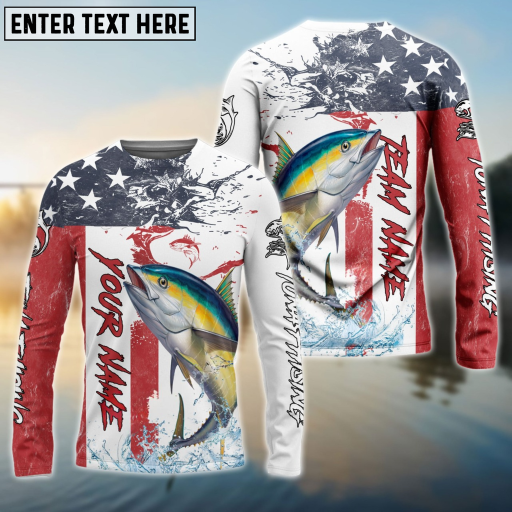 Maxcorners Tuna Fishing American Flag Seawave Personalized Name, Team Name 3D Long Sleeve Shirt
