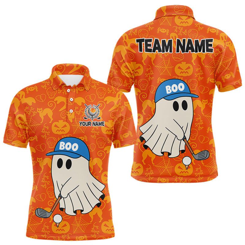 Maxcorners Personalized Funny Halloween Boo Orange Pattern Golf Polo Shirts For Men, Halloween Mens Golf Attire LM0910