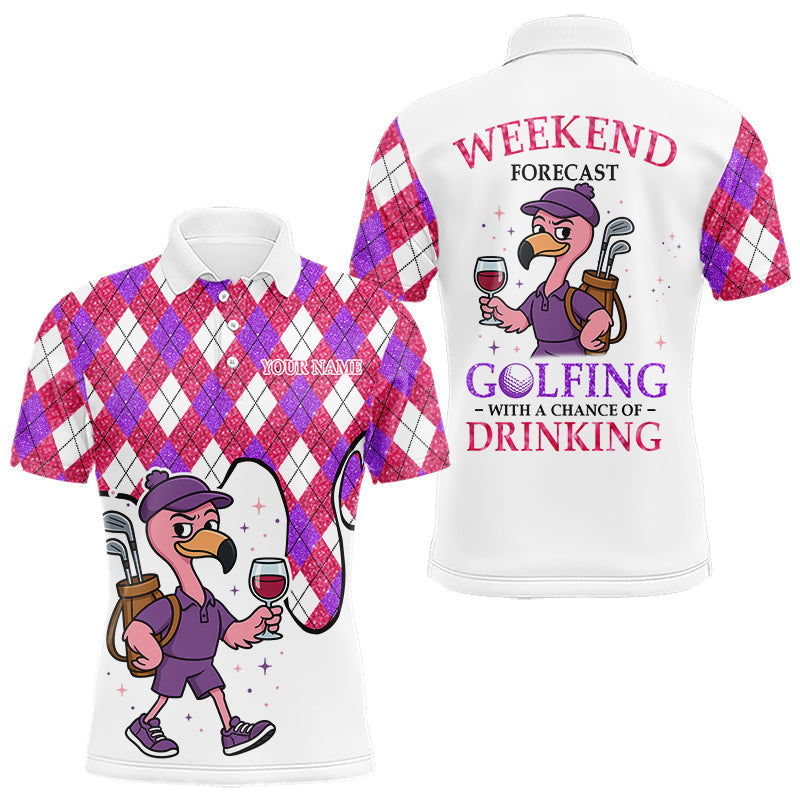 Maxcorners Pink & purple glitter argyle pattern Flamingo Men golf polo shirt Custom weekend forecast golf & wine MT2407