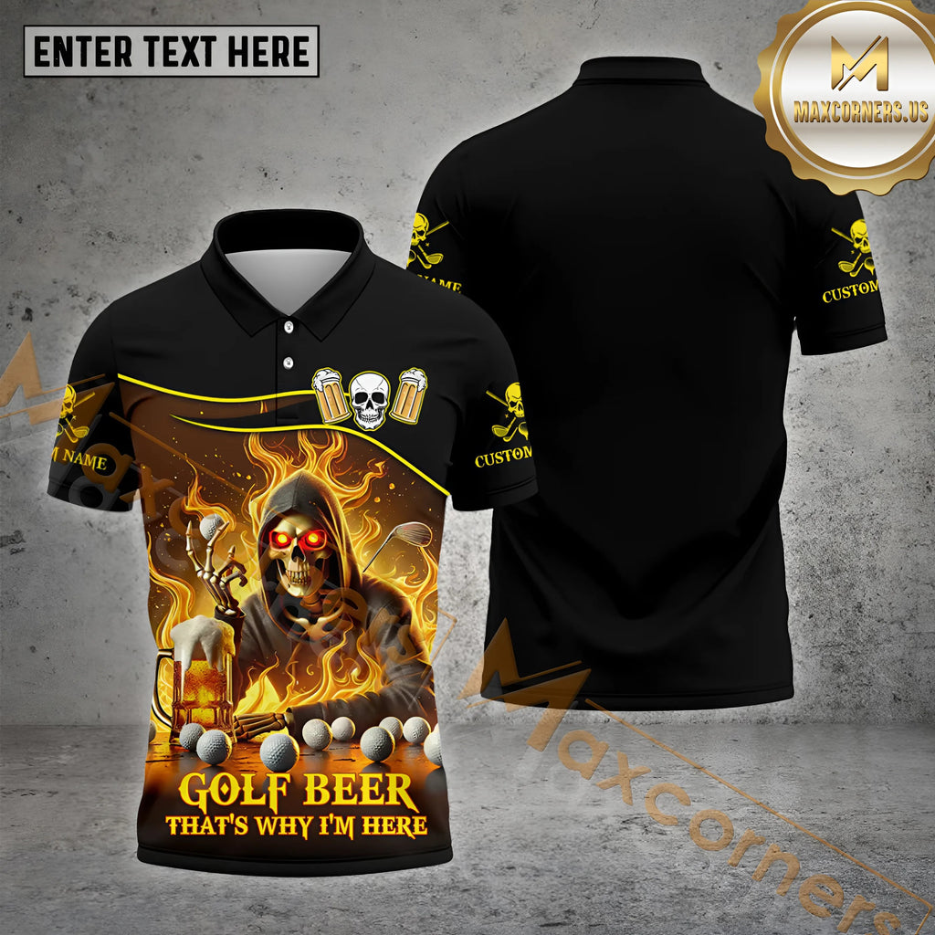 Maxcorners Grim Reaper Golf Shirt Flaming Skull Beer Options Personalized Name, Team Name 3D Shirt