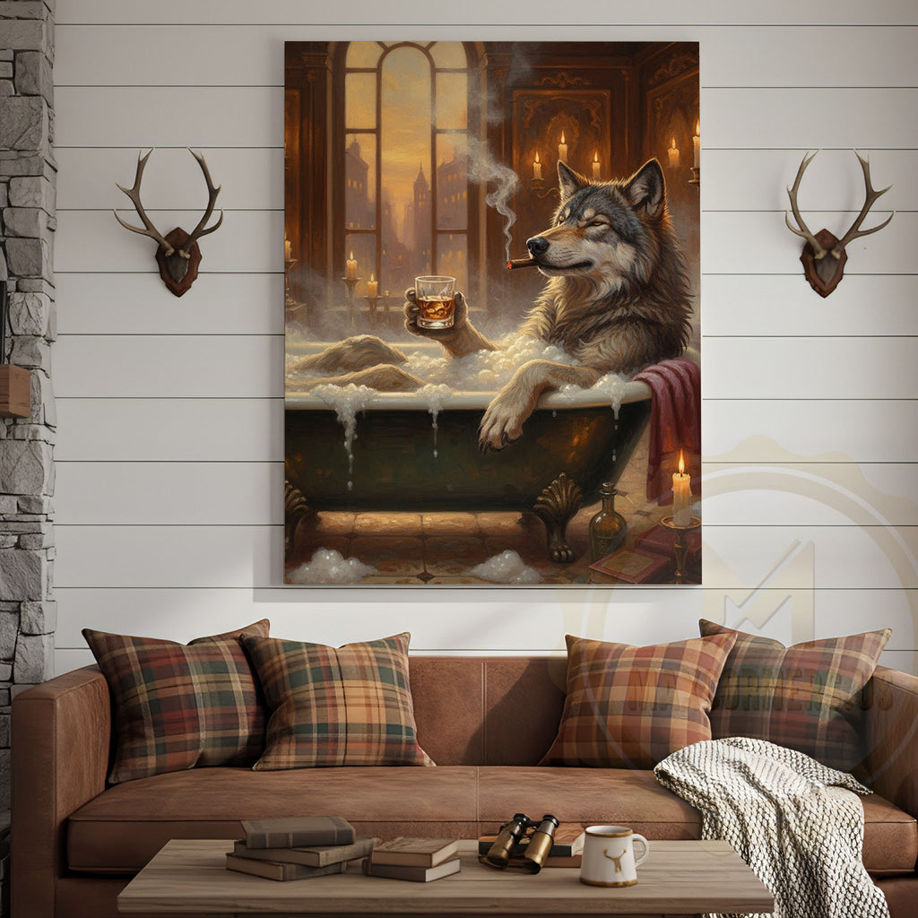 Maxcorners Relaxed Wolf in Luxury Bathtub with Whiskey and Cigar at Golden Sunset Wrapped Canvas Wall Art