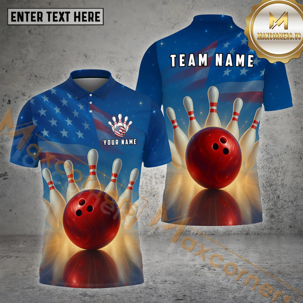 Maxcorners American Flag Lightning Bowling Jersey Customized Name, Team Name 3D Polo Shirt