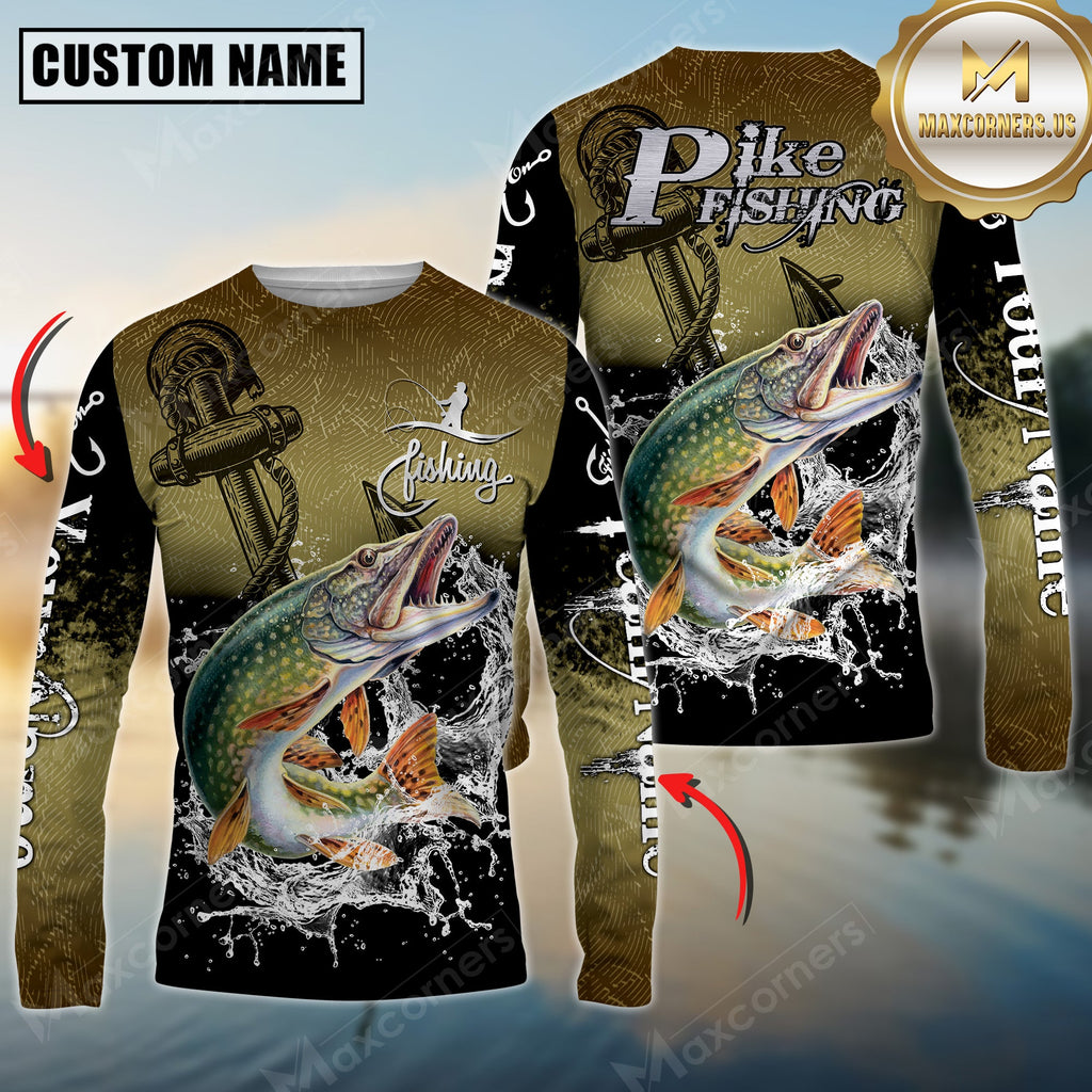 Maxcorners Pike Fishing Anchor Design 3D Printed Personalized Name, Team Name Long Sleeve Fishing Jersey