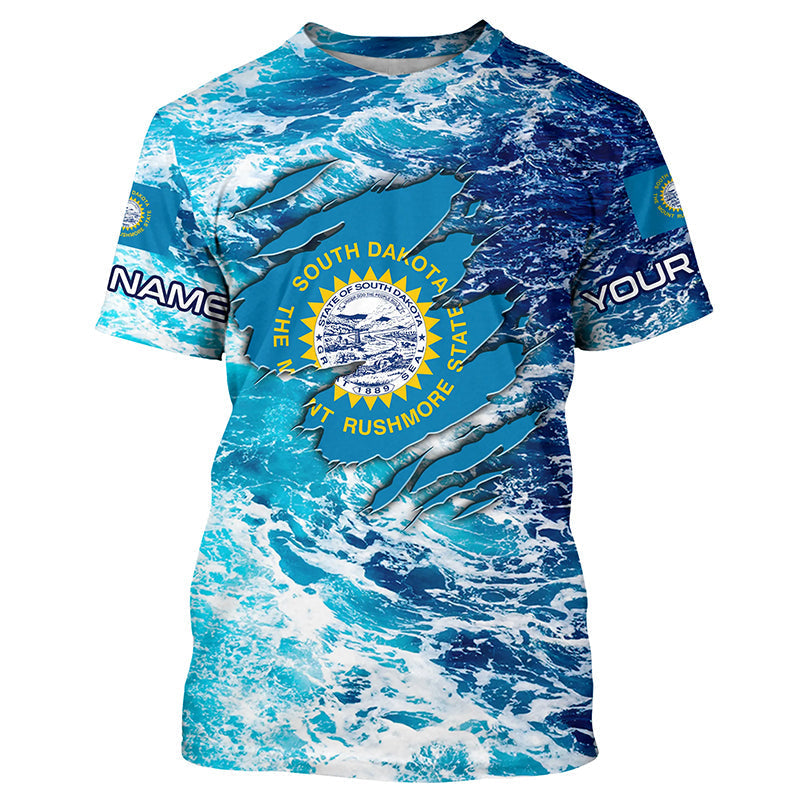 Maxcorners Blue sea wave ocean camo South Dakota flag patriot shirt Custom sun protection fishing shirts MT2108