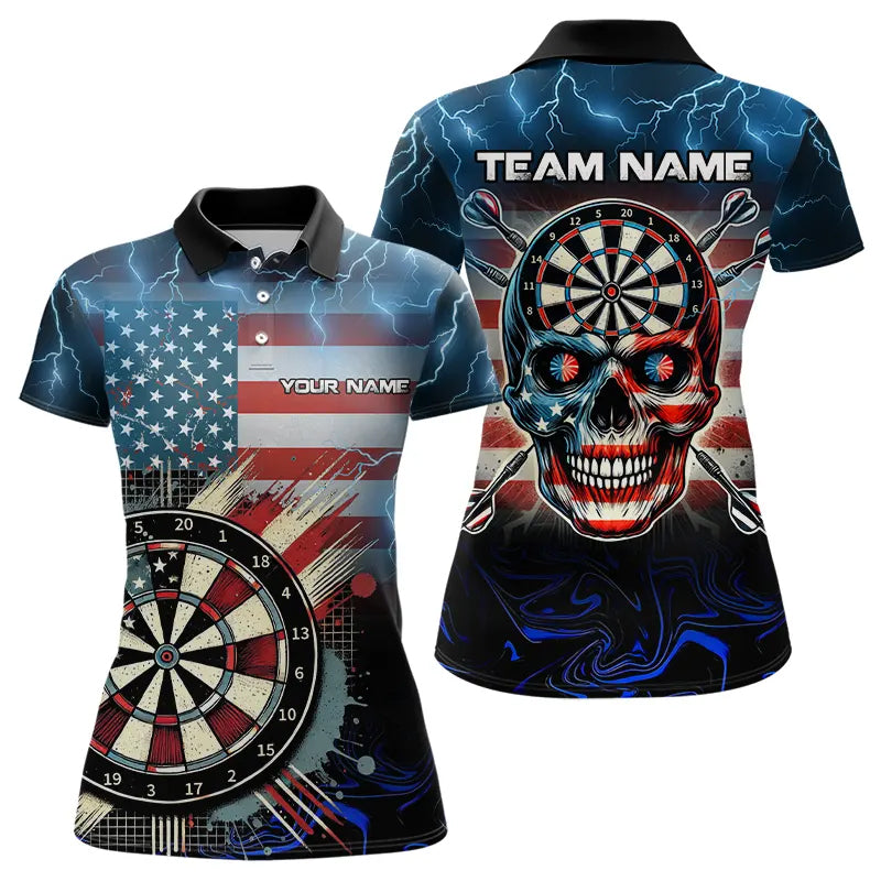 Maxcorners American Flag Skull Dart Board Blue lightning Custom Team Dart Polo, Quarter Zip Shirt For Women