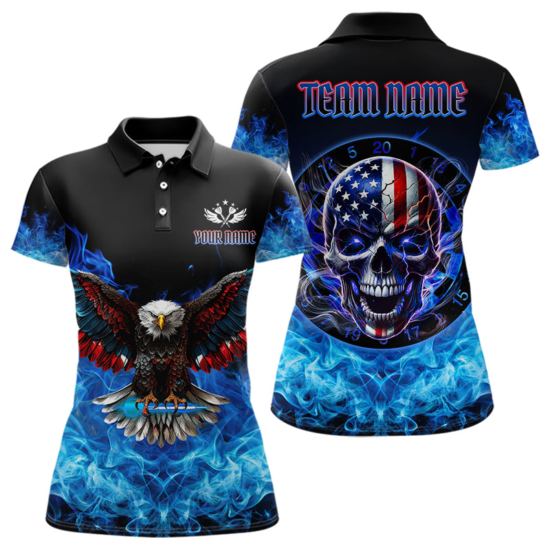 Maxcorners Blue Flame Smoke American Flag Eagle Skull Darts Polo, 1/4 Zip Shirts For Men Custom Darts Team Jersey
