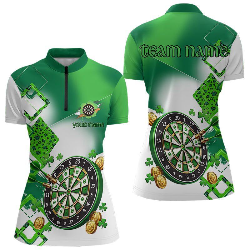 Maxcorners Green Shamrock Mens Darts Polo, Quarter Zip Shirts Custom St Patrick Day Team League Darts Jersey