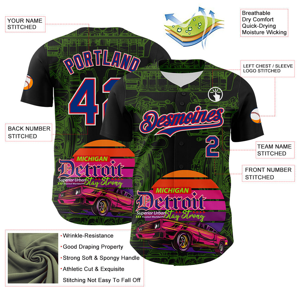 Maxcorners Custom Black Royal Green Fire Red-White 3D Pattern Design Detroit Cityscape Muscle Car Engine Premium Baseball Jersey LM0210