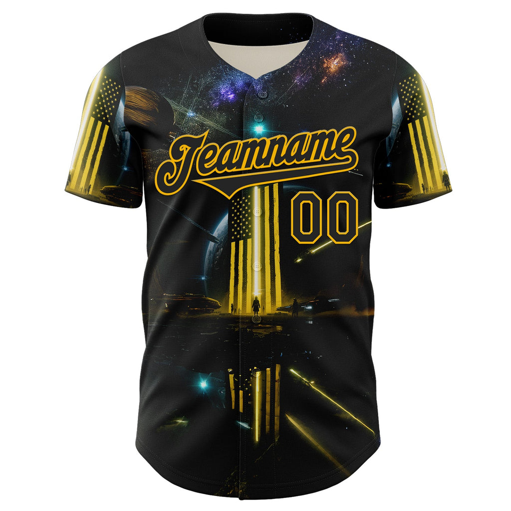 Maxcorners Custom Blue Navy-White 3D Pattern Design Outer Space Light Swords American Flag Premium Baseball Jersey LM0210