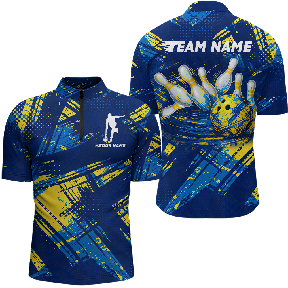 Maxcorners Custom Blue Yellow Bowling Jersey for Men Bowling Uniform Polo & 1/4 Zip Bowling Team Shirts MT2009