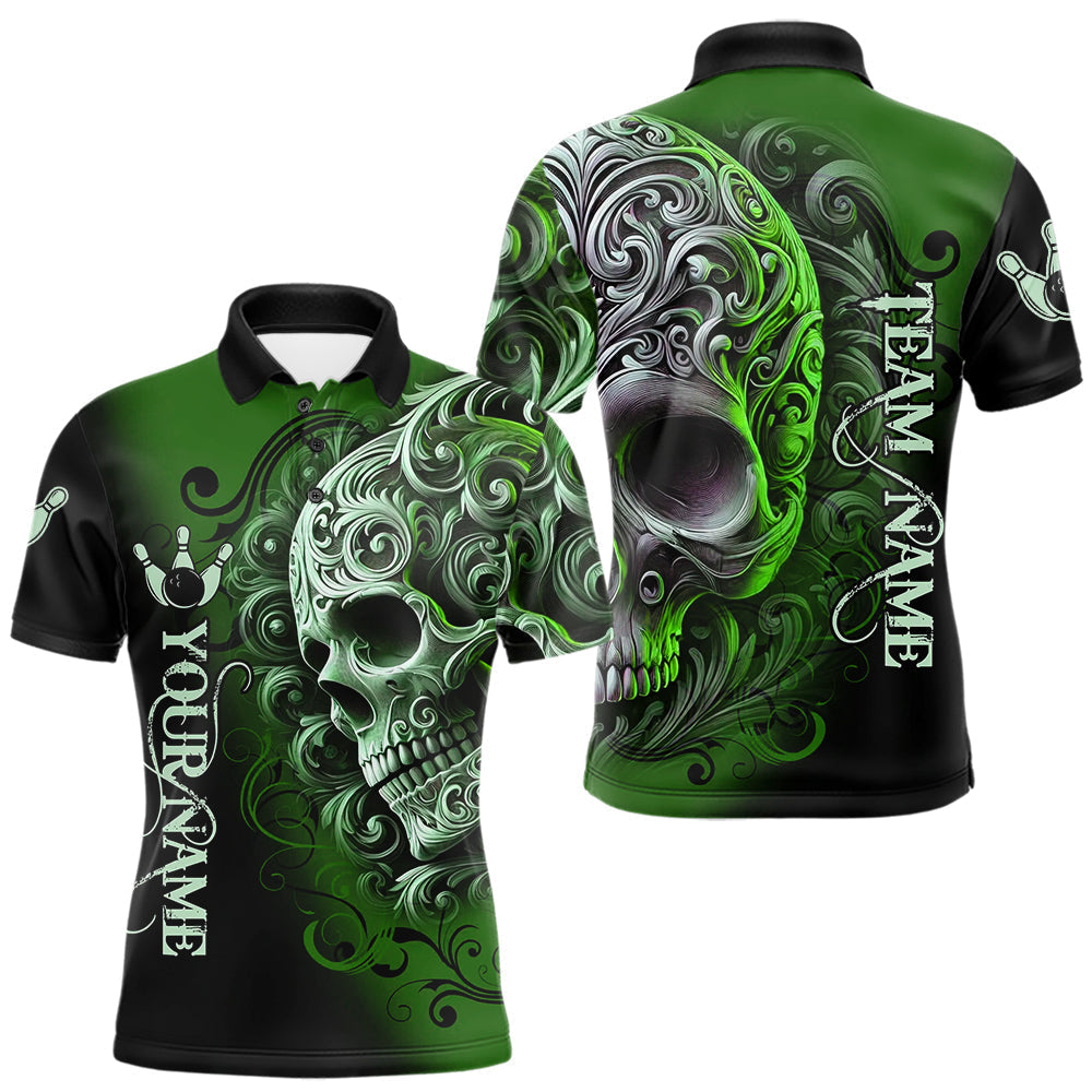 Maxcorners Green and Black Skull Scroll Men Bowling Polo, Quarter Zip Shirts Custom Skull Team bowling Jersey TU2310