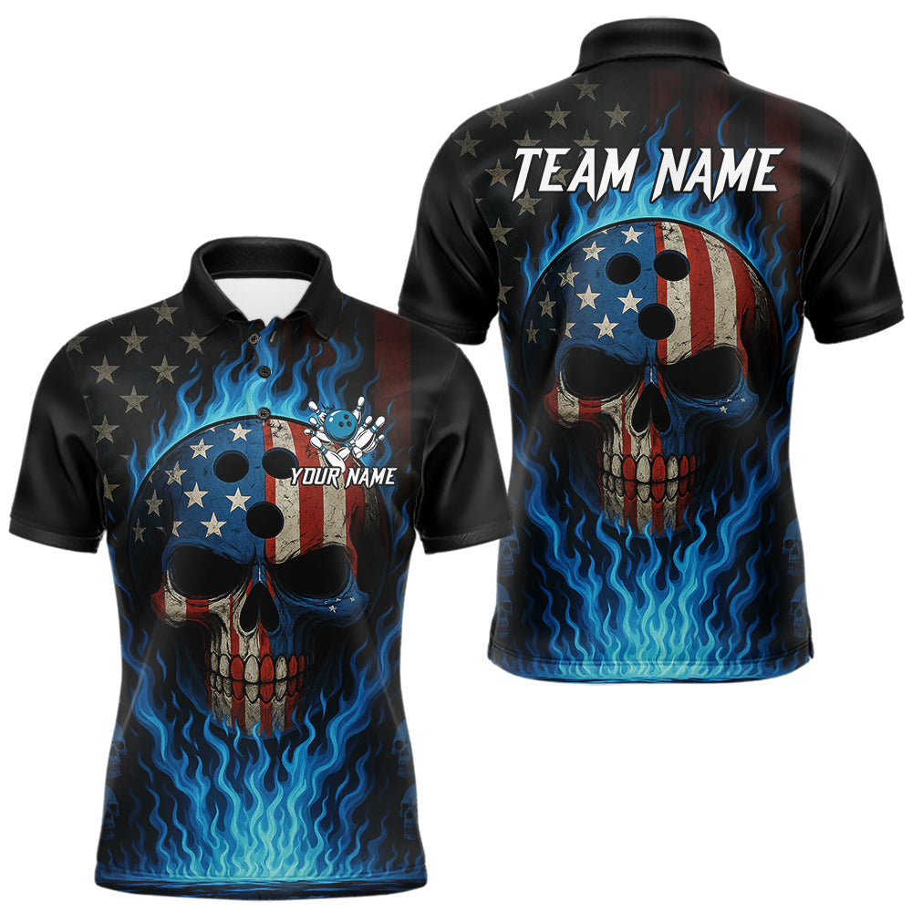 Maxcorners Personalized Blue Flame American Flag Skull Patriotic Bowling Polo, Quarter Zip Shirts for Men MT1810