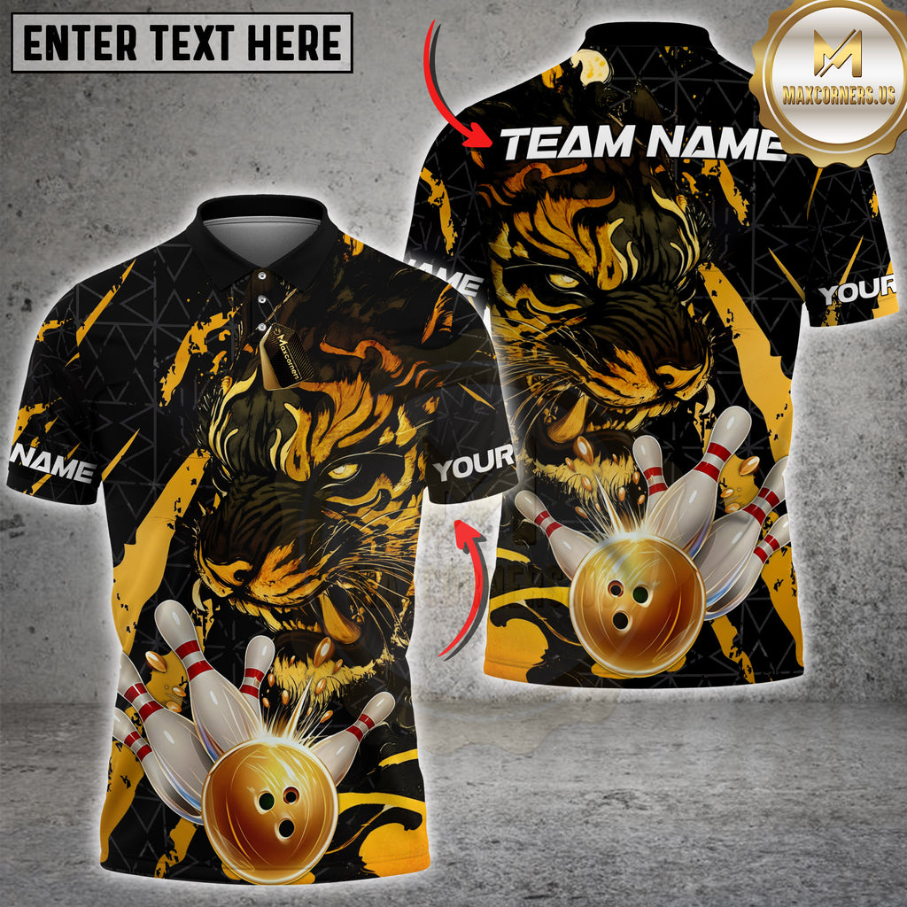 Maxcorners Bowling Shirt Tiger Golden Ball Striking Pins Multioptions Personalized Name, Team Name Unisex 3D Shirt (4 Colors)
