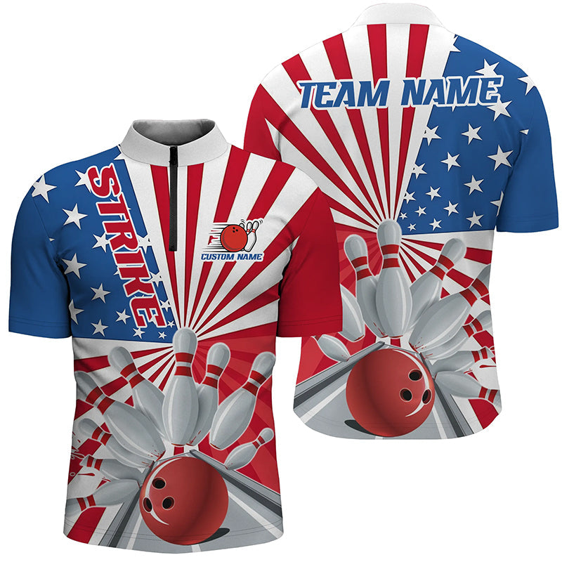 MaxCorners Bowling And Pins Patriotic Customized Name, Team Name 3D Stand Collar Zipper Polo Shirt For Men