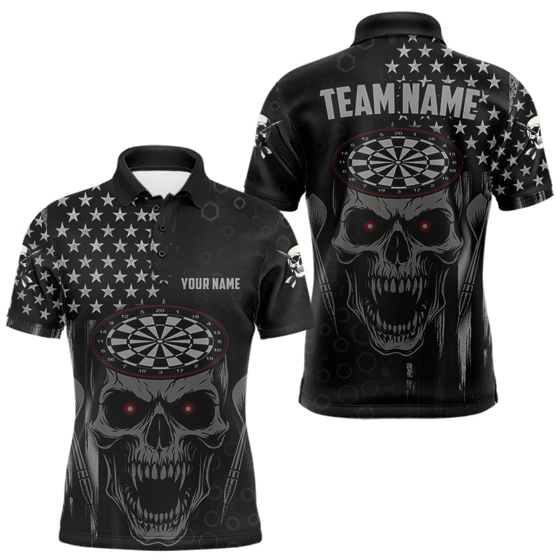 Maxcorners Custom Black Grey Grunge Skull Patriotic Dart Men Polo Jerseys USA Flag Dart Shirts LM2110