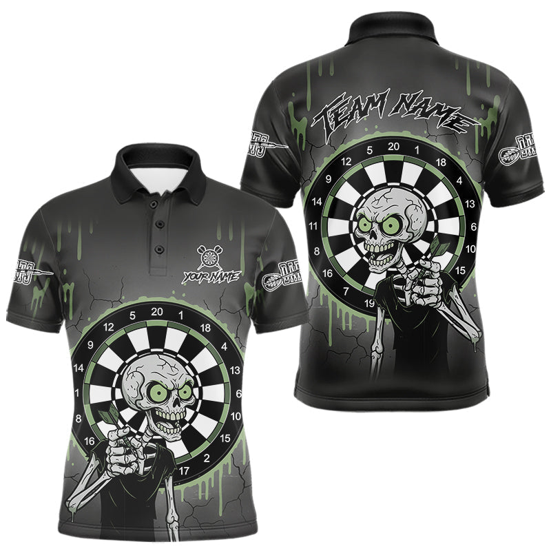 Maxcorners Custom Grey & Green Dartboard Funny Skeleton Dart Men Polo Jerseys Dart Team Shirts TU2310