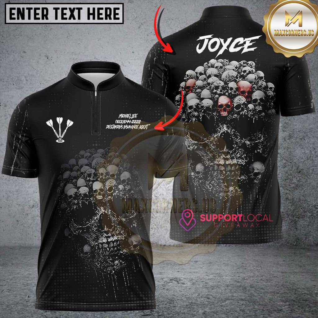 Maxcorners Personalized Skull Black Custom Darts Shirt Polo & 1/4 Zip For Men, Dart Team Shirts LM233 For Kerry