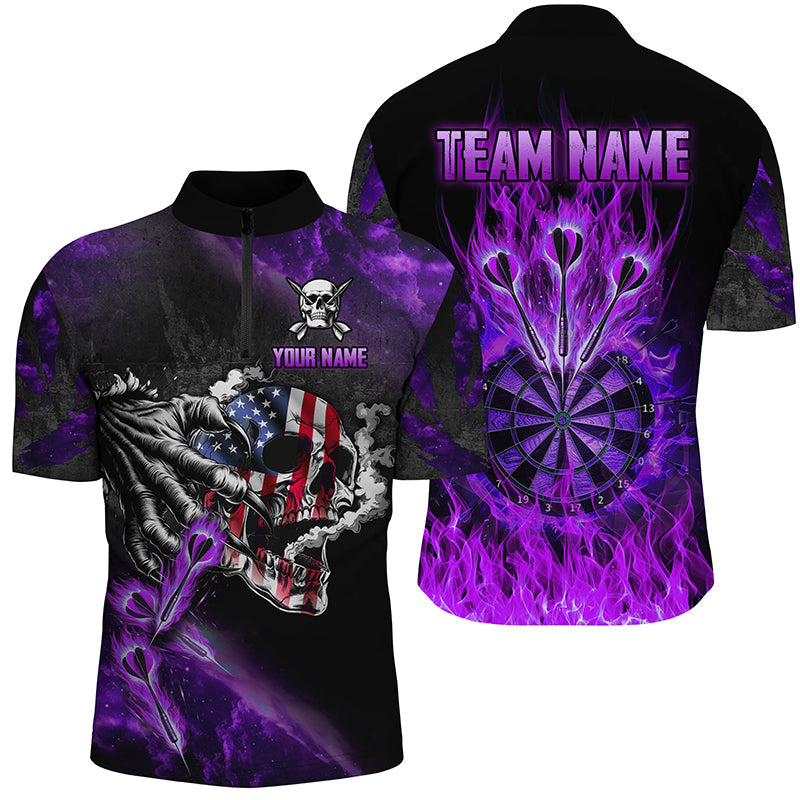 Maxcorners Purple Fire Flame Dartboard American Flag Skull Darts Jersey Customized Name, Team Name 3D Shirt