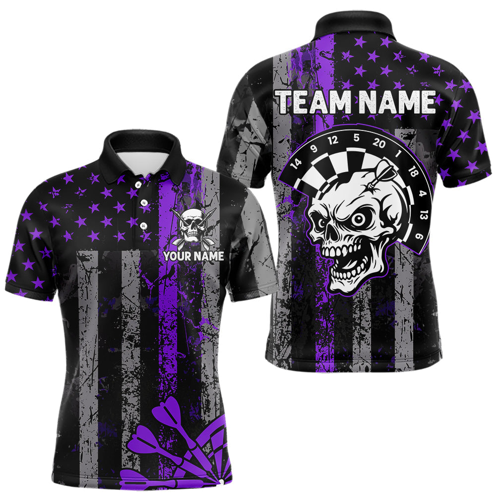 Maxcorners Personalized Purple Grunge US Flag Skull Darts Shirt For Men Custom Patriotic Darts Team Jersey TU2309