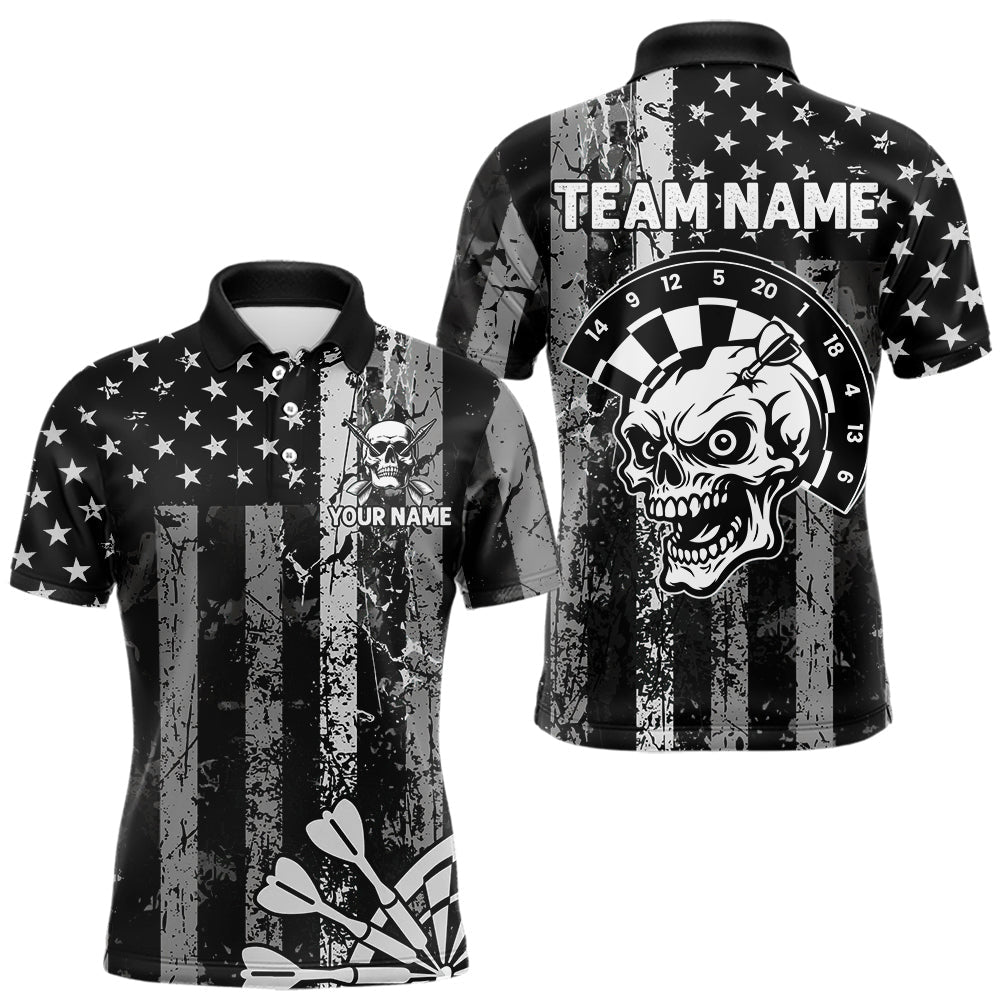 Maxcorners Personalized White Black Grunge US Flag Skull Darts Shirt For Men Custom Patriotic Darts Jersey TU2309