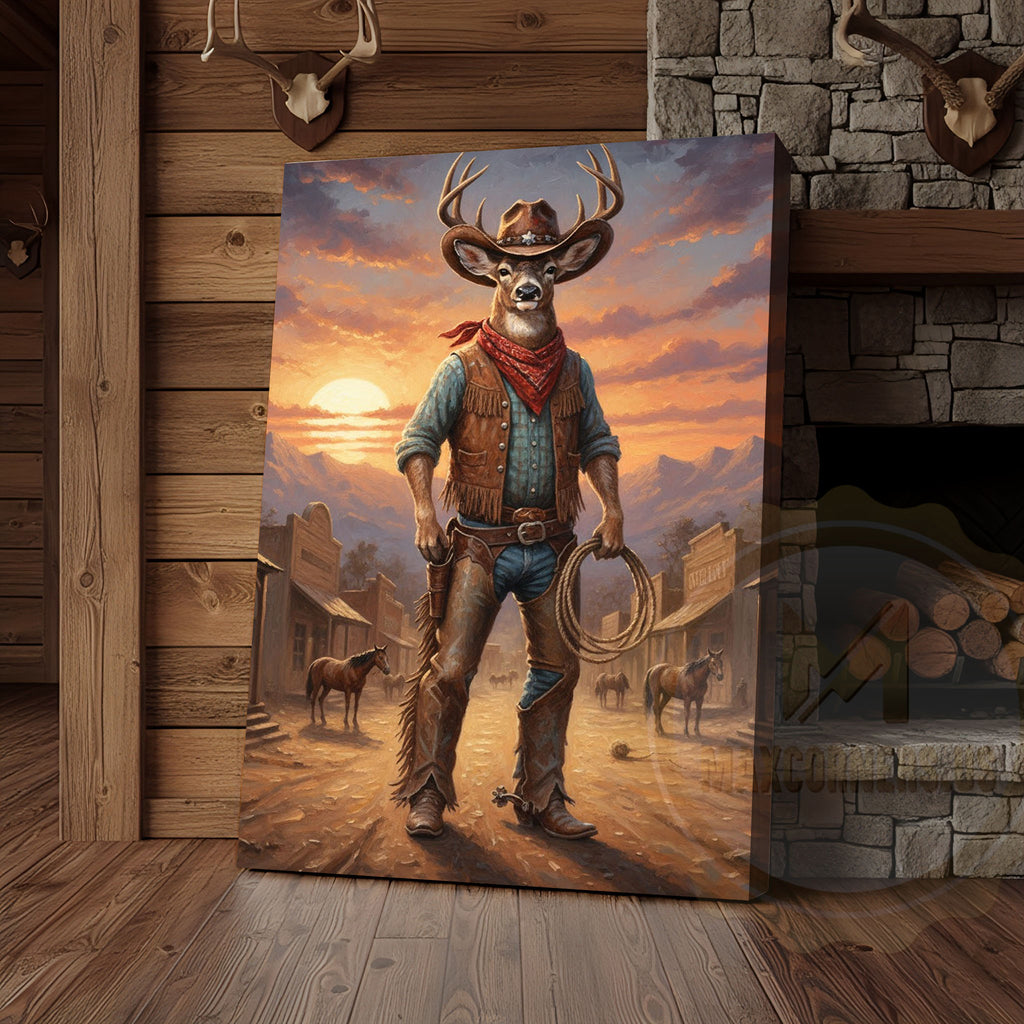 Maxcorners Cowboy Deer Standing in Sunset Western Town Wrapped Canvas